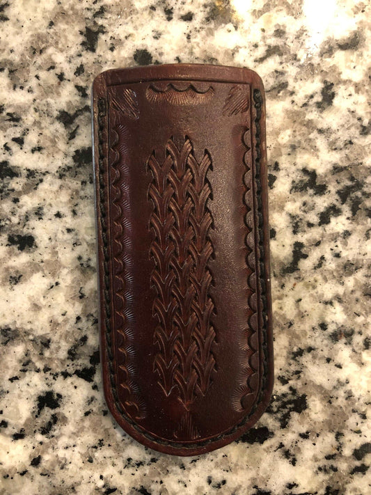 Knife Sheath For larger Folding Pocket Knife Hand Stamped Design Brown/Black