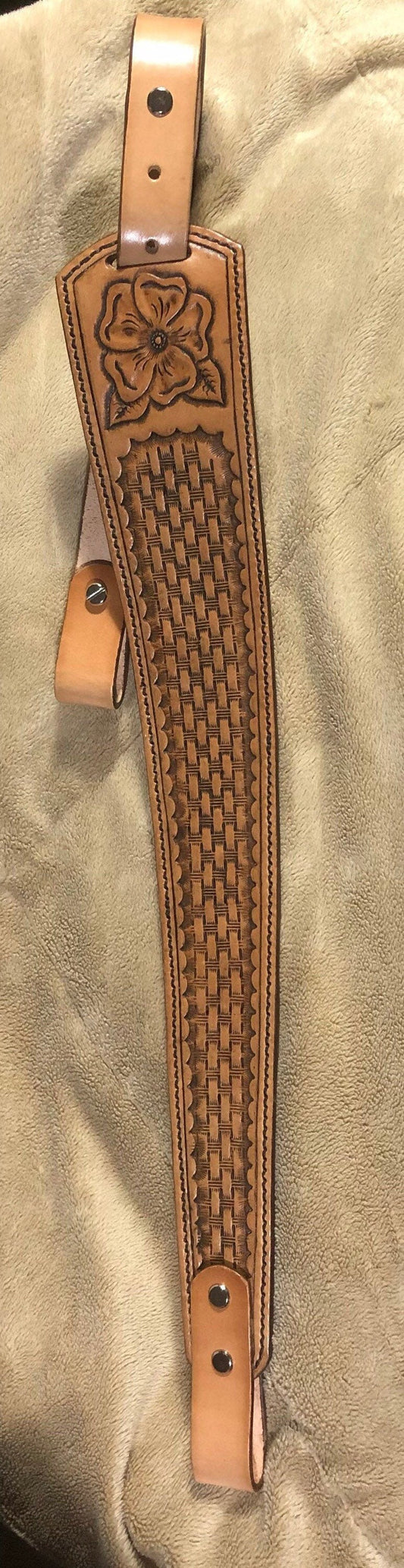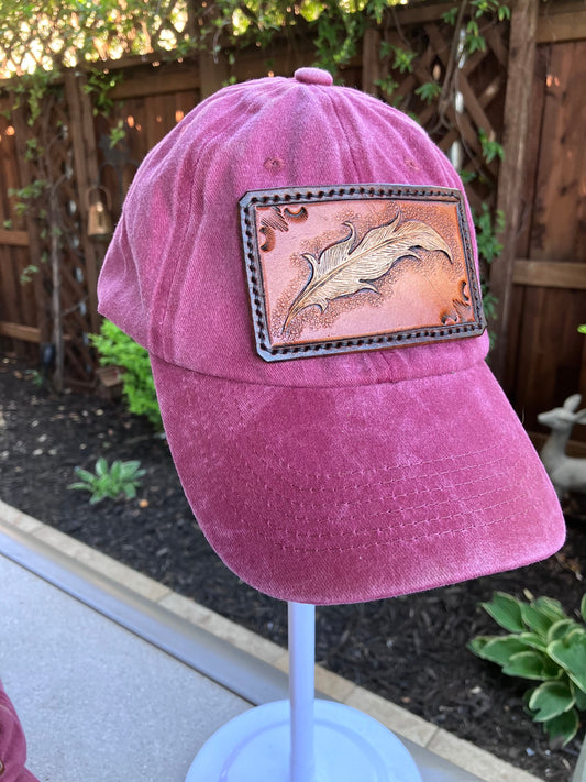 Hand Tooled Leather Hat Patch Feather sewn on Adjustable Cotton Baseball Cap