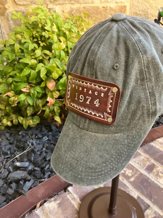 Custom Hand Tooled Leather Hat Patch on Adjustable Cotton Baseball Cap “VINTAGE YEAR”
